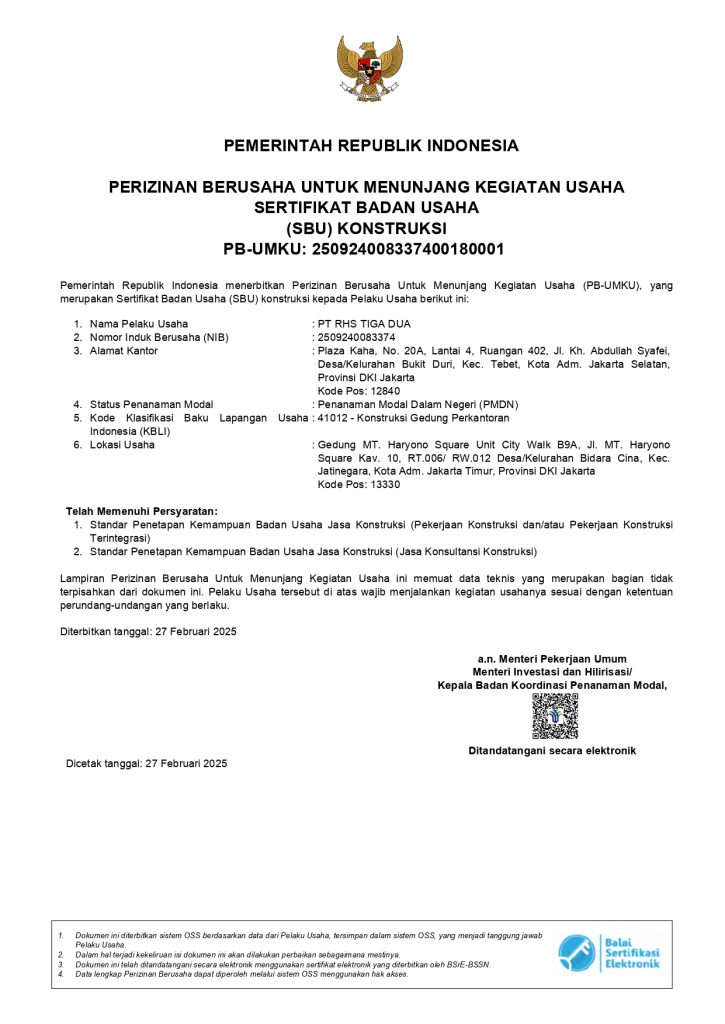 SERTIFIKAT BADAN USAHA (SBU) KONSTRUKSI GEDUNG HUNIAN (BG001)